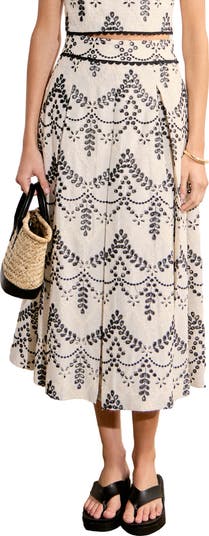 Cut from a lightweight linen-kissed blend, this flowy maxi skirt is accented with swirling stitching and airy eyelets.