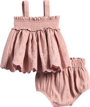 Airy embroidered eyelets border a swingy, organic cotton top with a smocked bodice that's paired with matching bloomers to complete the sunny-day look.