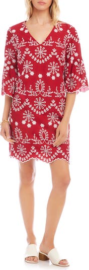 Go from Sunday brunch to shopping with friends in this lightweight cotton shift featuring intricate eyelet embroidery, a scalloped hem and flare cuffs.