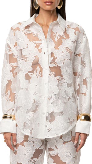 The button-up comes for your night-out look embroidered blooms topping a sheer backdrop.