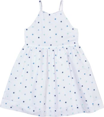 Timeless and elegant for spring celebrations, this dress is crafted from crisp white poplin embroidered with delicate floral details in soft 100% cotton. A back keyhole finished with spaghetti ties adds a graceful touch, while the classic waistline silhouette with a softly shirred skirt creates beautiful movement. Designed to fall to the knee and finished with a back zipper for easy dressing, it’s perfect for spring events, special occasions, and picture-perfect moments throughout the season.