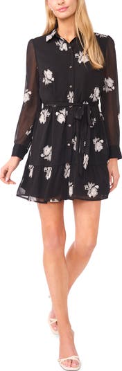 Sweetly stitched blooms animate a charming shirtdress cut to a leg-baring length and rendered in beloved black-and-white.
