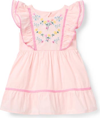 Embroidered florals, ric rac trim and ruffles too—all the details we love for our pure cotton dress.