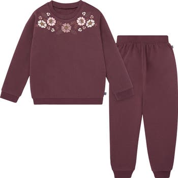 This girl’s sweatshirt and jogger set blends softness and style for the perfect fall outfit. Made from cozy, warm material, it’s ideal for crisp days and cool evenings. The sweatshirt features comfort-stretch ribbed trim at the neckline, wrists, and hem for a secure yet flexible fit, while the joggers match with a stretchy waistband and ankle cuffs. Embroidered multi-color flowers add a boutique-inspired finish, and the solid purple tone keeps it versatile and easy to wear. Layer the top over a tee or bodysuit for extra warmth—it’s comfy, charming, and ready for anything. Our essentials have been independently certified with STANDARD 100 by OEKO-TEX® so that you don’t have to worry about harmful substances in your little one's wardrobe. Pack includes sweatshirt and jogger set from modern moments™ by Gerber®®.