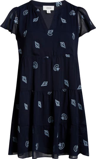 Beachy stitching enhances the charm of this light and lovely flared dress framed by fluttering sleeves.