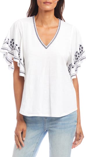 Intricate embroidery details the neckline and fluttery sleeves of this V-neck top that's made from organic-cotton jersey and perfect for adding some boho charm to your look.