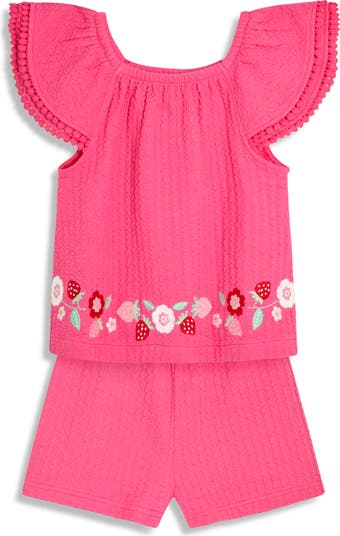 Matching shorts complete baby's look in this textured-cotton set with a frill-sleeve T-shirt edged in pompom trim and charming embroidery.