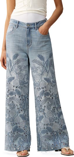 Enjoy the breezy, free-spirited feel of these floral-embroidered jeans featuring wide legs, raw hems and a hint of stretch.