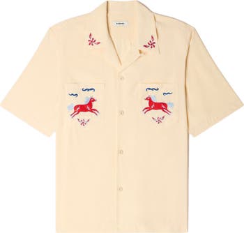 Loose-fit shirt with an embroidered shark collar, short sleeves, and two patch pockets embellished with horse embroidery.