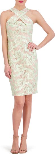 Swirling embroidery overlays delicate, flowery lace in this event-ready dress cut in a fitted silhouette.