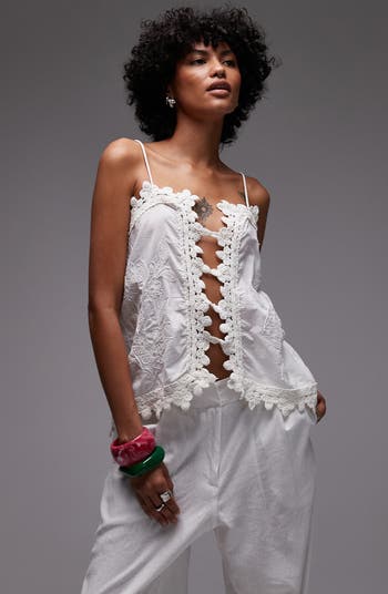 Dainty ties tether the open back of this breezy cotton cami made with swirling stitching for endless enchantment.