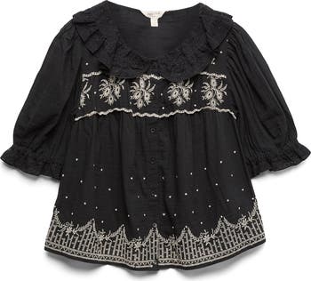 Cut from breezy cotton, this front-button crop top is accented with flowery stitching and sweetened with a lacy Peter-Pan collar.