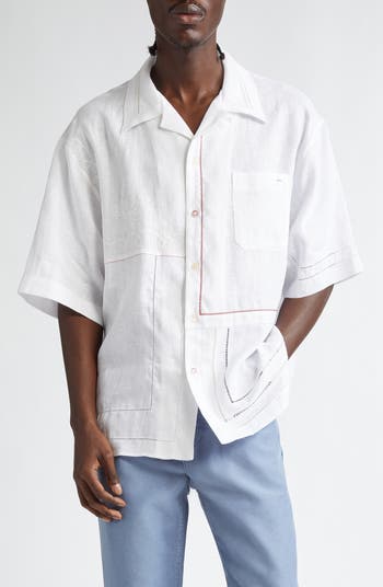 Put a fresh spin on your laid-back warm-weather look with this linen bowling shirt detailed with a bricolage of embroidery in assorted styles and hues.