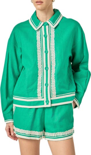 Contrast trim plays up the retro inspiration of this smooth and shiny linen-and-cotton jacket that buttons up the front.