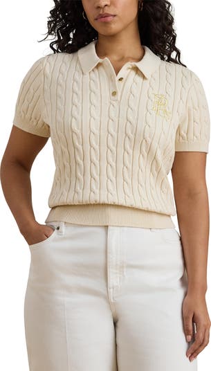 Extend sweater season in a short-sleeve cotton sweater accented with gilded buttons and an embroidered logo crest.