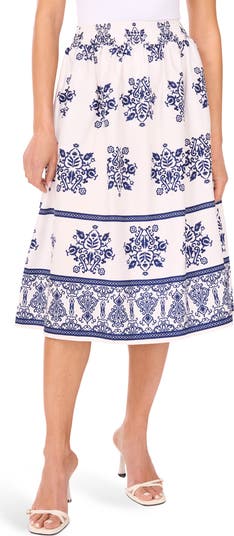 Nautical hues define a summery skirt stitched in intricate embroidery and topped with a comfy elastic waist.