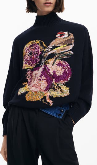 Intricate embroidery adds mixed-media charm to this avian-inspired sweater in a relaxed and comfortable fit.