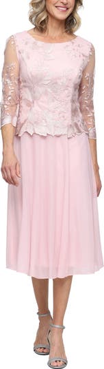Designed with the look of a coordinated top and skirt, this elegant dress offers polish for special occasions. The top is embroidered in an allover floral motif and styled with a scoop neckline, sheer three-quarter sleeves and princess seams for a flattering fit. A softly flared chiffon skirt completes the silhouette with graceful style that's ideal for a mother of the bride.