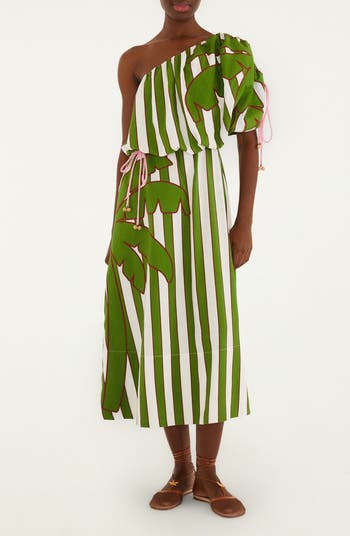 Adjustable bead-tipped drawstrings cinch the silhouette of this billowing linen-blend midi dress, made with a shoulder-baring silhouette and on-seam pockets.