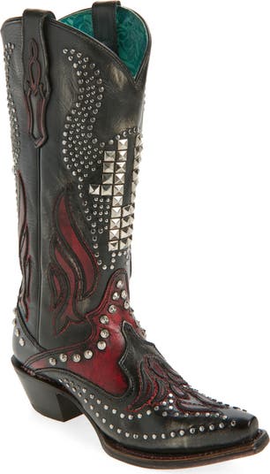 Intricate topstitching and polished studs define the smooth leather of a striking cowboy boot designed with a snip toe and stacked heel. Leather lining and plush cushioning help keep you comfortable all day long.
