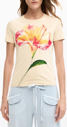 An appliquéd and embroidered mesh pansy pops at the center of a trim and slightly abbreviated T-shirt made from stretch-added cotton jersey.