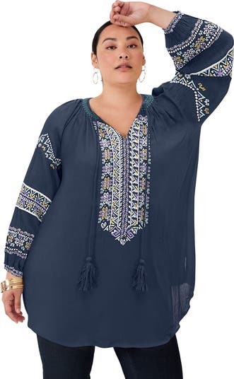 Get in touch with your boho side thanks to this pretty embroidered style. Finished with fun tassel ties at the neckline, it's outlined with voluminous puffed sleeves.