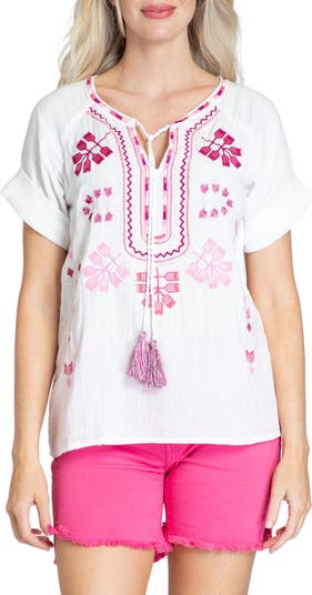 Lovely embroidery and tonal tassels sweeten the look of this relaxed peasant top that has rolled cuffs for added polish.
