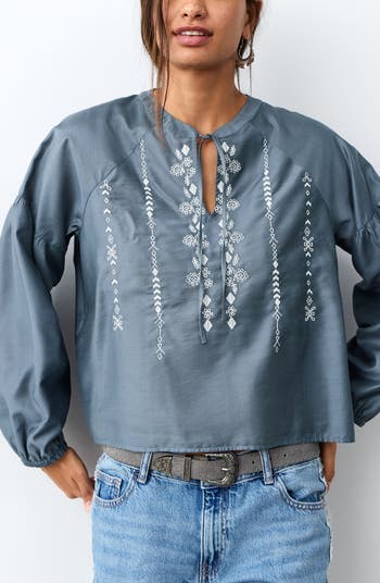 Enchanting embroidery sweetens and textures this tie-neck top made in a blousy fit and cut from a breezy, lightweight fabric.