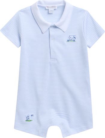Embroidered motifs add sweet and sporty style to a striped romper cut from soft pima cotton and featuring snaps at the legs for quick and easy changes.