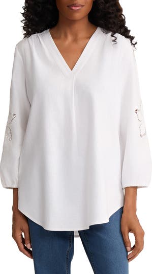 Tonal embroidery and openwork details spin the romantic vibes of this top cut from a cool, breathable linen blend that brings soft movement to the roomy silhouette.