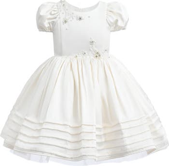 A timeless silhouette for child's most elegant moments—this dress blends delicate floral embellishments with soft pleats and puffed sleeves for a refined, classic look. Embroidered bodice with puff sleeves and bead accents. Full pleated skirt with layered texture and graceful volume.