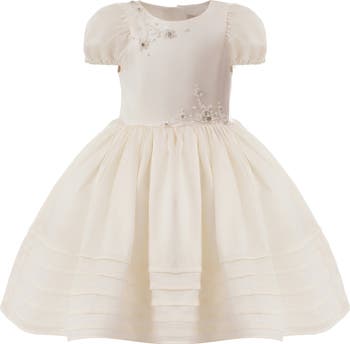 A timeless silhouette for baby's most elegant moments—this dress blends delicate floral embellishments with soft pleats and puffed sleeves for a refined, classic look.