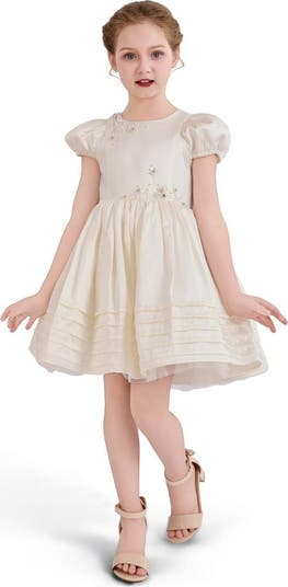 A timeless silhouette for baby's most elegant moments—this dress blends delicate floral embellishments with soft pleats and puffed sleeves for a refined, classic look.