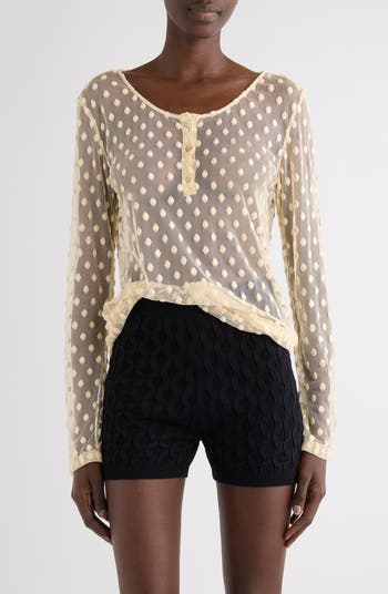 One of the signature sheer fabrications from Julian Klausner's spring '26 collection—embroidered polka dot mesh—speaks to the surf culture celebration theme in this loose-fitting henley design à la beachwear.