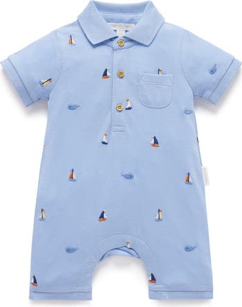 Functional and stylish, our Yacht Polo Romper is a playful addition to your little ones wardrobe. Featuring a fun all over embroidery of sail boats! Made from the softest 100% Cotton pique for a soft and breathable summer romper.