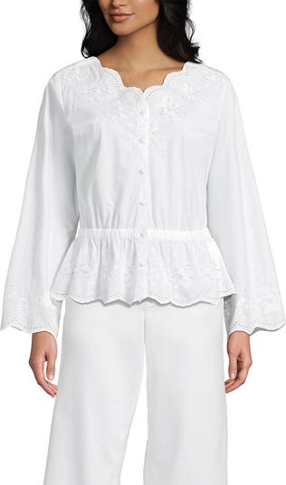 From the scalloped neckline to the ruffled cuffs, this blouse adds a romantic touch to everyday dressing. Finished with delicate embroidery and a flattering peplum waist, it's the kind of piece that feels just as easy as it is special. Choose from airy poplin or soft chambray.