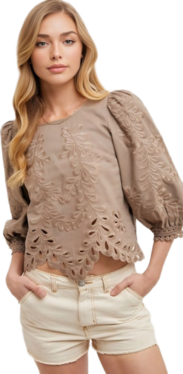 - Embroidered blouse with 3/4 puff sleeves, tonal stitching, cutout detailing, and a scalloped hem in a warm taupe hue for a polished yet effortless silhouette.