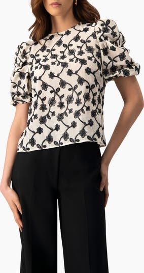 - Elegant blouse featuring delicate black floral embroidery over a natural-toned base. Designed with romantic puff sleeves and a straight silhouette