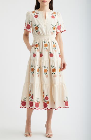 Cut from crisp poplin, this flared midi is framed by puff shoulders and sweet scalloped trim. Enchanting floral embroidery and a smocked waist enhance the charm of this lovely look.