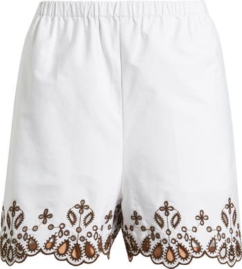 Elevate your warm-weather wardrobe with these crisp, midweight cotton-poplin shorts finished with eyelet embroidery along the hem.