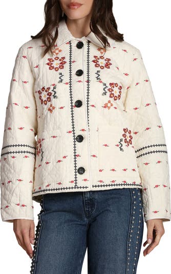 Oodles of homespun charm tell the style story for a quilted cotton jacket embellished in sweet stitchwork.