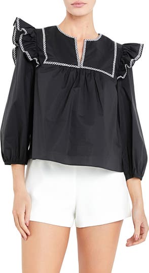 Frilly ruffles and contrast embroidery highlight a balloon-sleeve top cut from airy, breathable cotton in a boxy silhouette.
