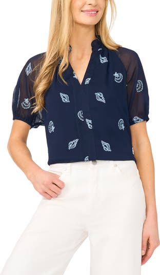Sheer puff sleeves frame this ruffle-neck top featuring coastal embroidery details all over.