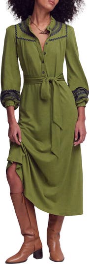 Intricate embroidery and ruffle trim frame the yoke and cuffs of this cotton-blend midi shirtdress styled with three-quarter sleeves and a waist-defining tie.