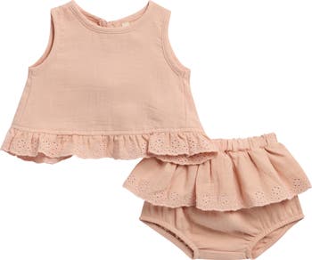 Delicate embroidery and ruffle trim bring charming detail to this organic-cotton tulip top paired with matching bloomers for a soft, comfy fit that keeps your baby looking sweet.