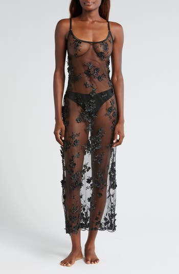 Embroidered blooms sprawl along the stretchy mesh of this sheer chemise.