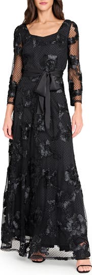 A satiny tie defines the waist of this full-of-romance gown accented with swirling stitched blooms and sprinkled with flocked dots.