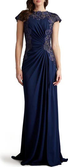 Floral embroidery trims the neck and sides of a floor-sweeping gown fashioned with delicate ruching for contemporary allure.
