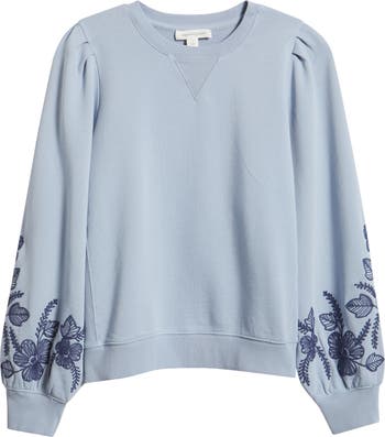 Pleated shoulders give slight volume to the sleeves of this all-cotton sweatshirt featuring tonal floral embroidery on the sleeves.
