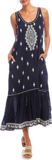 Enchanting embroidery patterns this airy sleeveless midi made with a flouncy hem for flowy movement.